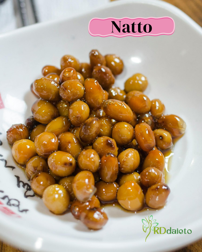 Natto contains probiotics that enhance gut flora and natto kinase, an enzyme that aids protein digestion and reduces bloating. It also supports nutrient absorption and improves gut motility.
