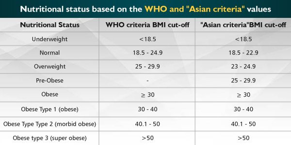 After calculating the BMI, we can check our body nutritional status like underweight, normal or obese. Generally below 18.5 is categorized as ‘underweight’, 18.5-24.9 (for Asian, it is not more than 22.9) is described as ‘normal’ above 25 is considered as ‘overweight’ and above 30 is categorized as ‘obese’.